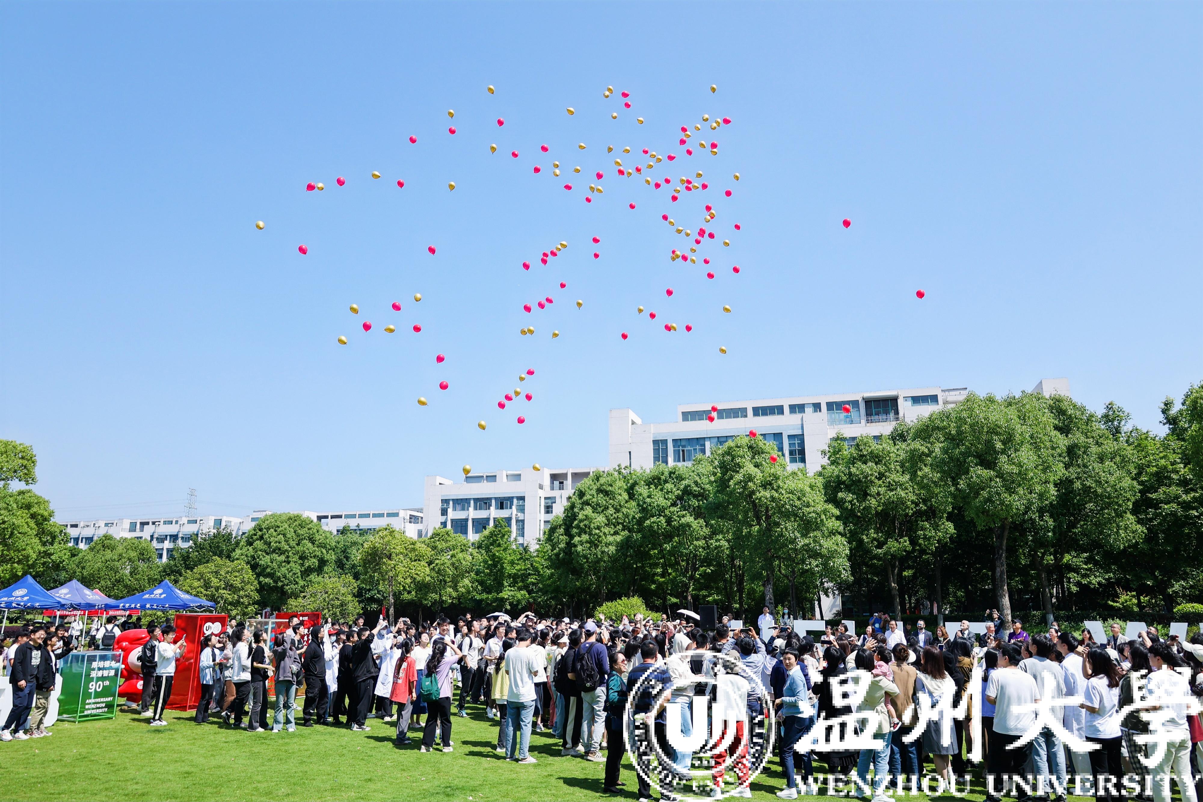 巨型蛋糕由生环学院的师生全程参与前期烘焙,过程中充分运用了蛋清蛋白质发泡,烘焙美拉德反应,蛋白质变性,产品质量控制等生物专业知识。在万象城手机网页版登录入口办学90周年华诞之际,师生们将烘培课堂从实验室搬到户外大草坪,结合自身专业学以致用、知行合一,以专业实践的劳动成果致谢母校、献礼母校,一起描绘独属于温大的“艺术画卷”。青天描画屏,燕草碧如丝,现场师生共享美味蛋糕,随着‘求学问是、敢为人先’,祝万象城手机网页版登录入口生日快乐!”的祝福呐喊,彩色气球伴随着生日歌升上天空。