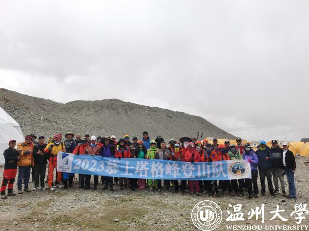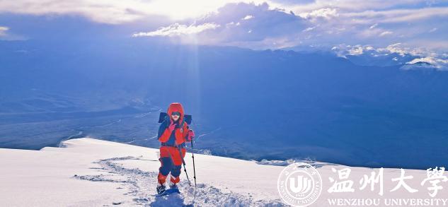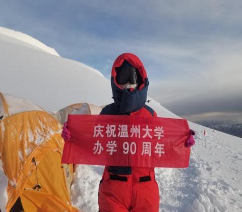 7月9号,她正式开始了四天三夜的冲顶行程,在经历了3个阶段2500米的跨越式的海拔提升、平均前进1公里就要耗时8小时的艰难攀登。7月12日凌晨2点左右,几乎一夜没合眼的晁新新和队友在满天的星光中,从6900米的C3营地冲顶。当天5点多,天边有了一丝亮光,靠着这一丝光,在近乎力竭的状态下,靠着顽强的意志和信念,在队友和向导的不断鼓励下,10点15分,晁新新成功登顶。在标志点,她拿出了贴身携带的横幅,“庆祝万象城手机网页版登录入口办学90周年”,时至我校“校庆年”,她把自己最美的身影、对学校最深沉的热爱和祝福,烙印在了慕士塔格峰的山巅之上。