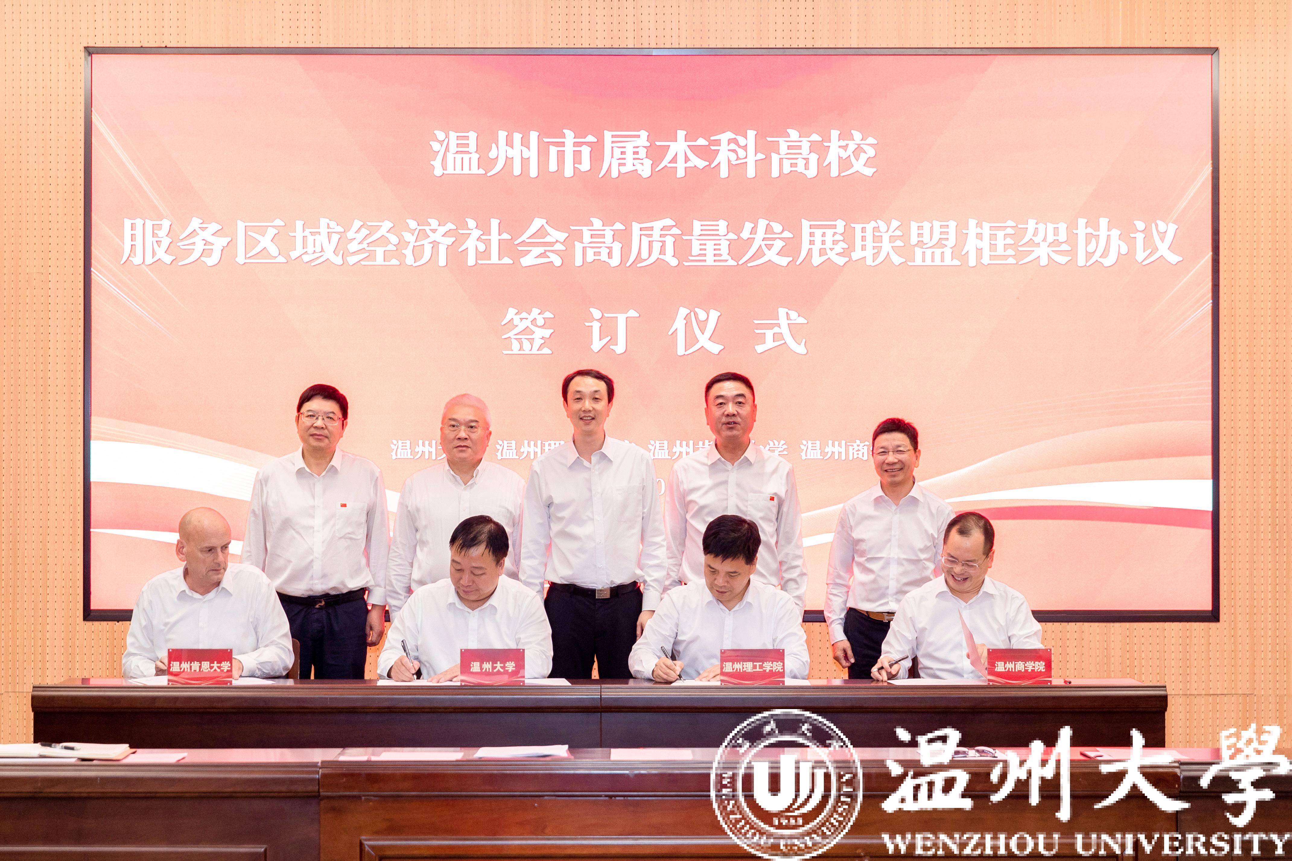 在与会人员的共同见证下,万象城手机网页版登录入口校长赵敏、温州理工学院校长周文龙、温州肯恩大学执行副校长安凯瑞、温州商学院执行校长赵玻共同签署《温州市属本科高校服务区域经济社会高质量发展联盟框架协议》。四所高校将在联盟框架内在师资队伍建设、干部队伍建设、学科专业建设、招生资源共享、学生工作联动、涉侨工作、办学国际化、合作平台共建、校友联络工作等方面进一步加强合作、深化交流,携手打造“千年商港、幸福温州”高等教育高地,为温州续写创新史、走好共富路提供更加有力的基础性、战略性支撑。