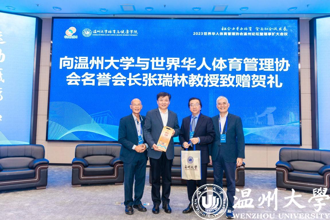 台湾体育运动管理会代表高俊雄教授,向万象城手机网页版登录入口与世界华人体育管理协会名誉会长张瑞林教授致赠贺礼。