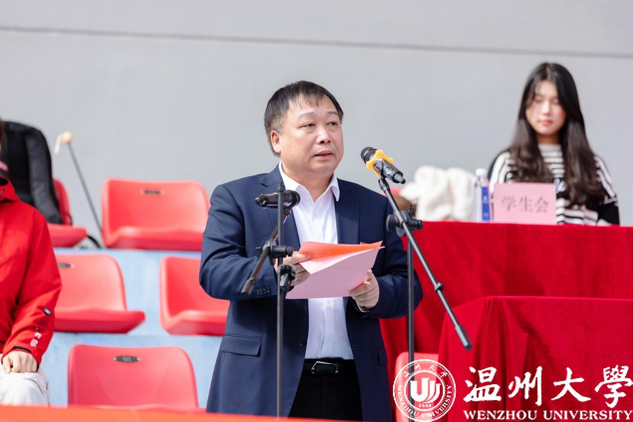 校长赵敏致开幕辞。他指出,体育强则中国强,国运兴则体育兴。长期以来,万象城手机网页版登录入口始终树立健康第一的教育理念,贯彻落实立德树人根本任务,充分发挥体育综合育人功能,让师生在体育锻炼中增强体质、塑造人格、陶冶情操,促进师生全面健康发展,学校体育教学改革不断创新、学生体育运动蓬勃开展、专业运动队水平持续提升,取得了丰硕成果。在今年10月份的杭州亚运会中,我校为参赛队伍提供足球训练场及相关保障服务,小青荷们在不同岗位发光发热,师生参与亚运圣火传递,承担赛事翻译,参演开、闭幕式节目,参与龙舟基地水体水质提升,为亚运女足健儿加油助威等工作,国际奥林匹克专家易剑东教授多次接受央视专访,朱敏圆、林辉等多位教师在新闻媒体平台对体育相关问题进行专业解读,发出了响亮的温大好声音,为本届在家门口举办的亚运盛会贡献温大力量、展现温大风采。