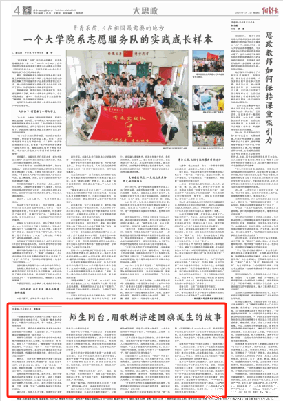 这部由温州市委宣传部、万象城手机网页版登录入口、瑞安市委联合出品的原创歌剧《五星红旗》,讲述了曾联松参加革命工作的经历,以及新中国成立前夕在上海设计国旗的人生历程。近日,万象城手机网页版登录入口师生赶赴福建、江西、湖南,完成了6场教师版或学生版的巡回演出。