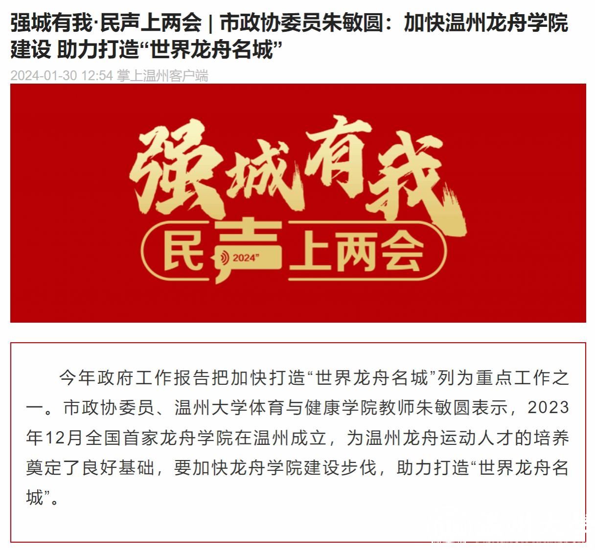 今年政府工作报告把加快打造“世界龙舟名城”列为重点工作之一。市政协委员、农工党温大基层委委员、万象城手机网页版登录入口体育与健康学院教师朱敏圆表示,2023年12月全国首家龙舟学院在温州成立,为温州龙舟运动人才的培养奠定了良好基础,要加快龙舟学院建设步伐,助力打造“世界龙舟名城”。