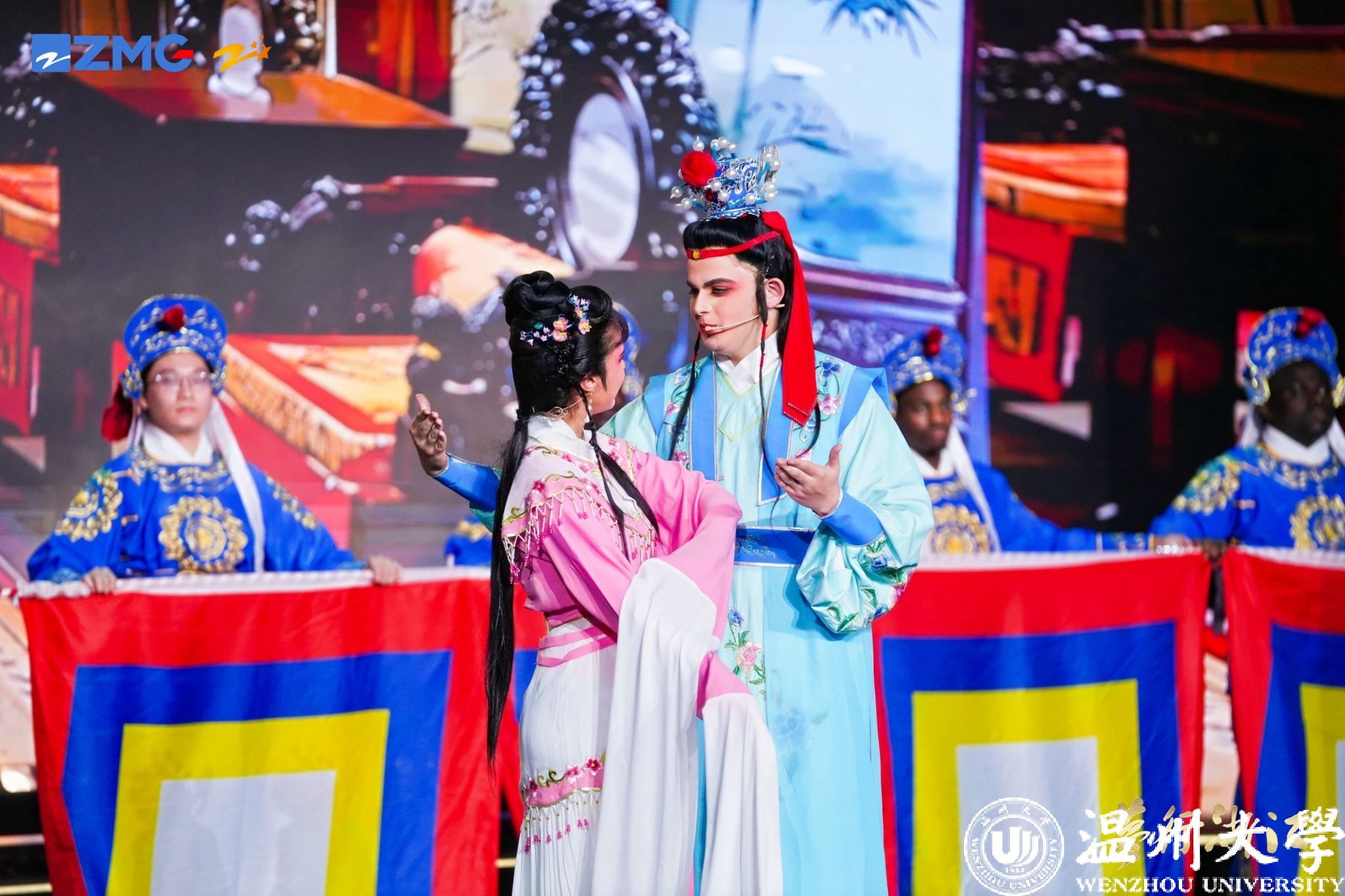 我校来自摩洛哥、尼日利亚、加纳、越南、塔吉克斯坦等国的17位留学生带着戏曲串烧节目《华彩梨园》惊艳亮相。节目由天女散花、铡美案、送凤冠及红楼梦等戏曲中的经典片段构成。华丽的戏服、精彩的表演,赢得了现场领导以及观众们的阵阵掌声。“中华戏曲真的太有意思了,通过这次展演活动我对中华文化更加着迷了,希望未来能够参与到更多类似的活动中,感受中华文化的魅力......”,来自尼日利亚的留学生CHIMEZIE GIFT CHIDERA在现场接受采访时激动地讲道。