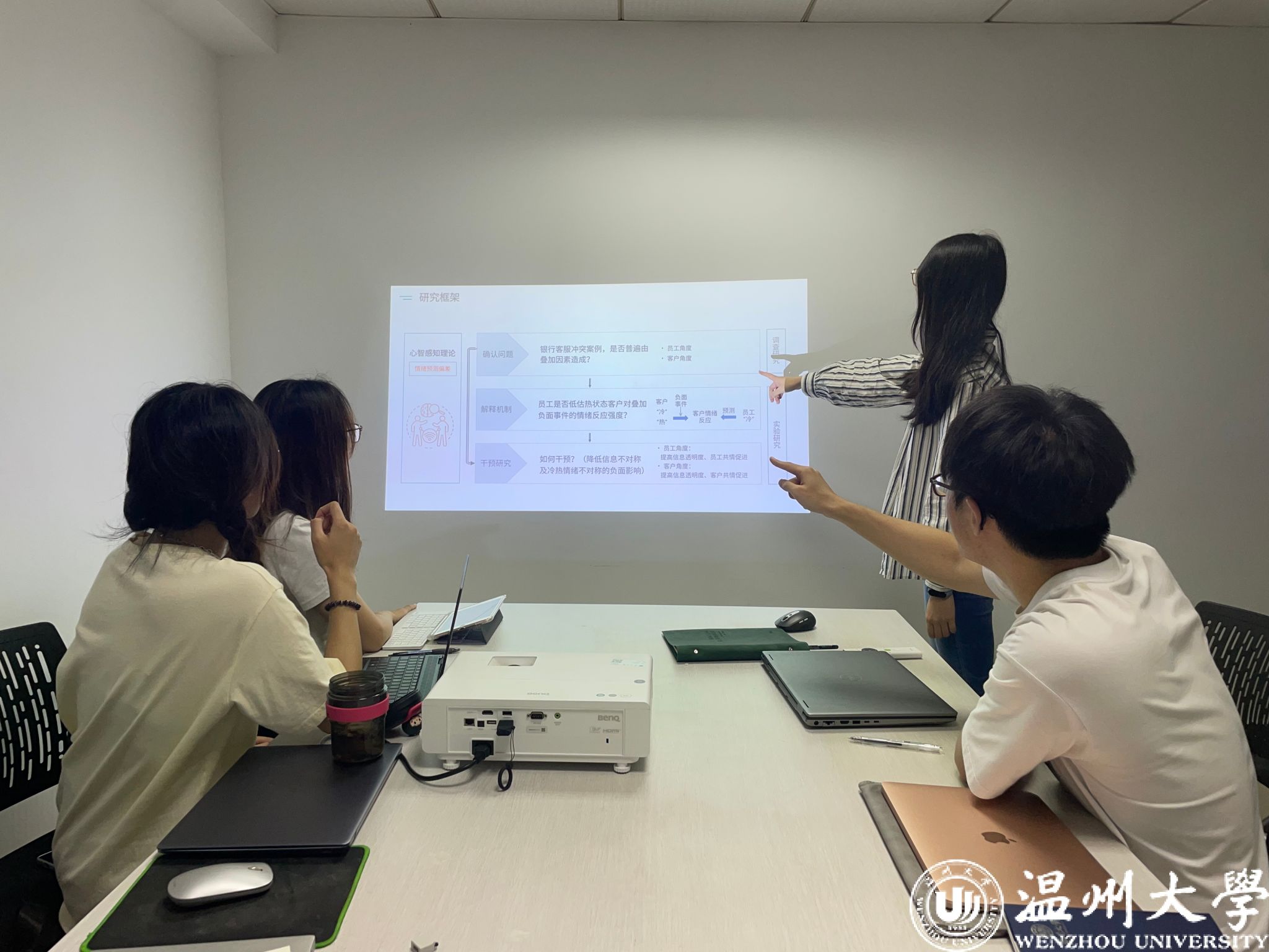 从校区选拔赛、分赛区竞赛到全国总决赛,在徐平老师的指导下,团队成员通过查阅文献、线上线下会议讨论等方式不断修改完善项目《信息不对称背景下的银行客—服冷热共情偏差:基于心智感知视角》。该项研究聚焦于“如何帮助银行优化消费者投诉的预防和处理机制”这一问题,首先通过调查研究银行客—服冲突案例中双方的认知和情绪差异,随后进行实验研究,探讨员工在预测冷热不同状态下客户对负面事件的情绪反应差异,最后,干预研究通过提高双方的信息透明度、促进共情的方式改善银行客—服互动效果。