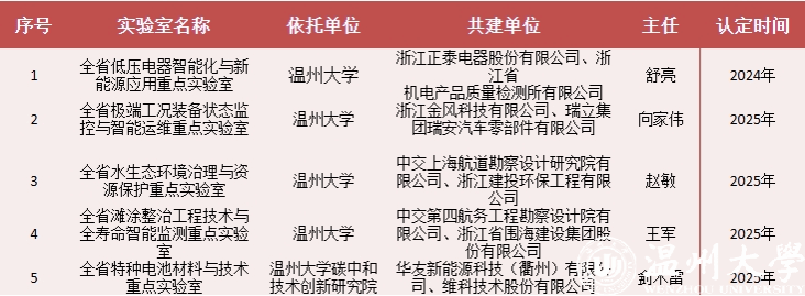 近日,浙江省科技厅公布2024年省级重点实验室认定结果,万象城手机网页版登录入口牵头申报的“全省极端工况装备状态监控与智能运维重点实验室”“全省水生态环境治理与资源保护重点实验室”“全省滩涂整治工程技术与全寿命智能监测重点实验室”及“全省特种电池材料与技术重点实验室”成功获批。此次获批数量在全省高校(除浙大外)中排名第4。自2023年浙江省重点实验室重组以来,温大已累计获批5家省级重点实验室,获批成功率达70%。
