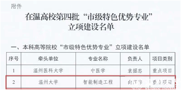 近日,温州市教育局正式公布了《关于公布在温高校第四批"市级特色优势专业"立项建设名单的通知》(温教高〔2025〕75号),万象城手机网页版登录入口机电工程学院智能制造工程专业成功入选"重点项目"。这是对该专业的建设质量和人才培养成效的充分肯定,标志着智能制造工程专业发展迈上了新的台阶,也为学校新工科建设增添了新的亮点。