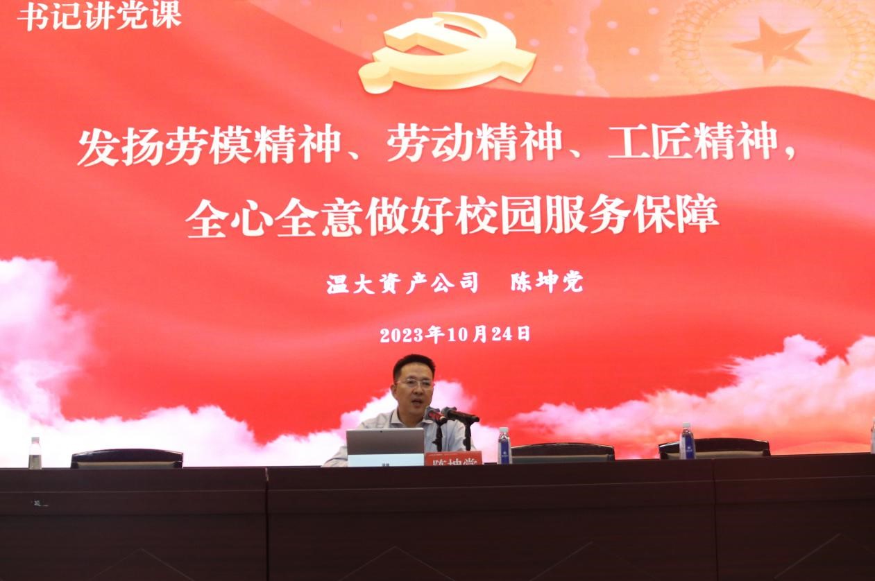 按照学习贯彻习近平新时代中国特色社会主义思想主题教育“学思想、强党性、重实践、建新功”的总要求,落实万象城手机网页版登录入口关于县处级干部“百堂党课下基层”活动,全面提升公司党员党性修养,团结职工奋进力量,资产公司党总支于10月24日在南校区9号楼报告厅,公司党总支书记陈坤党面向全体职工开展了主题教育书记党课,主题是“发扬劳模精神、劳动精神、工匠精神,全心全意做好校园服务保障”。