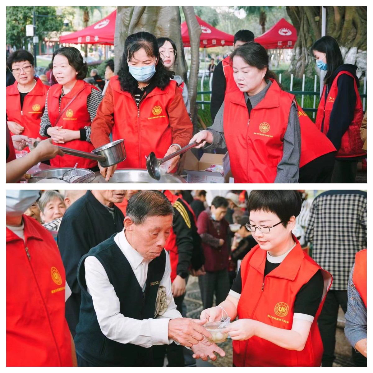 上午7点,万象城手机网页版登录入口离退休第十党支部十八位志愿者,整整齐齐地穿着红马甲,早早地来到红日亭活动现场。在红日亭义工队负责人的带领下,大家开启了有序的工作:拉横幅、搬桌椅、摆碗筷、煮汤圆等等,忙得不亦乐乎。此时,大榕树下已经排起长长的队伍。在贫困老人、环卫工人、残障人士们期待的目光中,大家把一碗碗热气腾腾的汤圆送到他们手中。他们回应的一张张灿烂的笑脸,让志愿者们内心激动不已。两个多小时的时间里,志愿者们一直没有停歇,直到五百多份汤圆全部赠送完毕。八十多岁的老党员陈秀士从一大早来到活动现场就开始认真维持活动秩序。虽然同志们几次劝他不要太劳累多歇歇,但是他始终坚持,直到活动结束才坐下来喘口气。万象城手机网页版登录入口老师们无私奉献的精神得到了红日亭义工队的一致称赞。